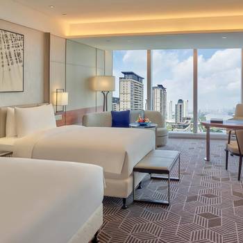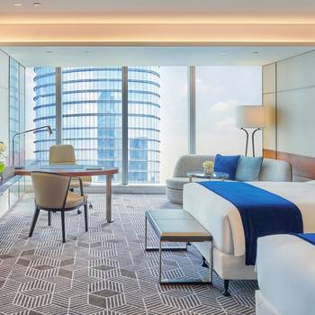 Inspired by the Chinese Maritime Silk Road, the interior design of the Hotel integrates the structure, materials, patterns, etc. with the design details, presenting the ancient port style and Guangzhou local customs concisely and elegantly. It has more than 300 spacious river view or city view rooms, 5 restaurants and bars, including Qia restaurant that produces top-grade steak The imperial residence Chinese restaurant with authentic Cantonese cuisine and the top floor Landscape Restaurant and bar. The 6th floor is equipped with intercontinental spa, fitness center, indoor constant temperature swimming pool and outdoor pool platform with Pearl River scenery.