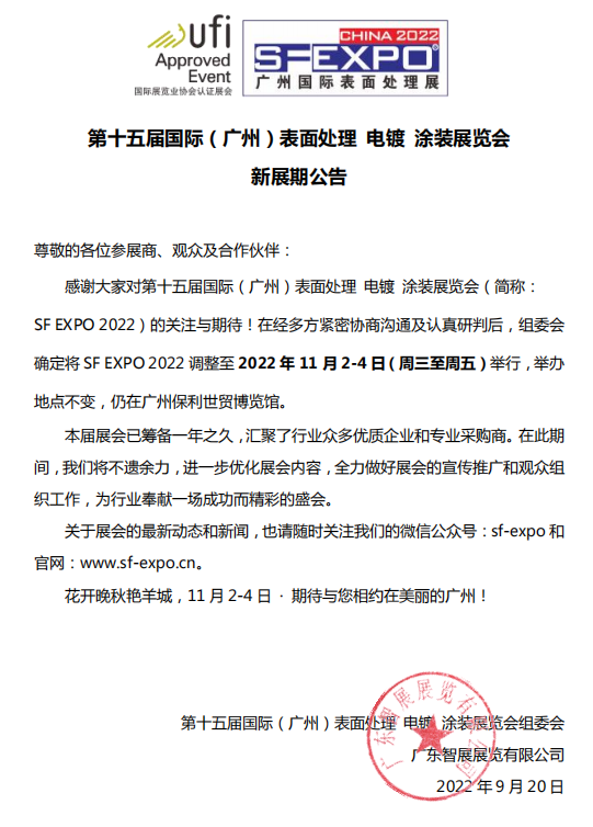 感谢大家对第十五届国际(广州)表面处理 电镀 涂装展览会(简称:SF EXPO 2022)的关注与期待!在经多方紧密协商沟通及认真研判后,组委会确定将SF EXPO 2022调整至2022年11月2-4日(周三至周五)举行,举办地点不变,仍在广州保利世贸博览馆。